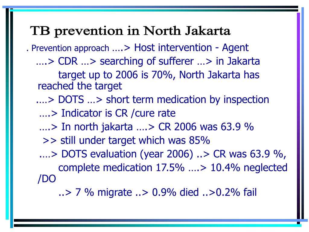 TB prevention in North Jakarta . Prevention approach ….> Host intervention - Agent ….> CDR …> searching of sufferer …> in Jakarta target up to 2006 is 70%, North Jakarta has reached the target .…> DOTS …> short term medication by inspection ….> Indicator is CR /cure rate ….> In north jakarta ….> CR 2006 was 63.9 % >> still under target which was 85% .…> DOTS evaluation (year 2006) ..> CR was 63.9 %, complete medication 17.5% ….> 10.4% neglected /DO ..> 7 % migrate ..> 0.9% died ..>0.2% fail