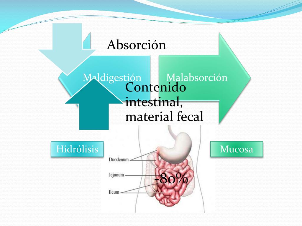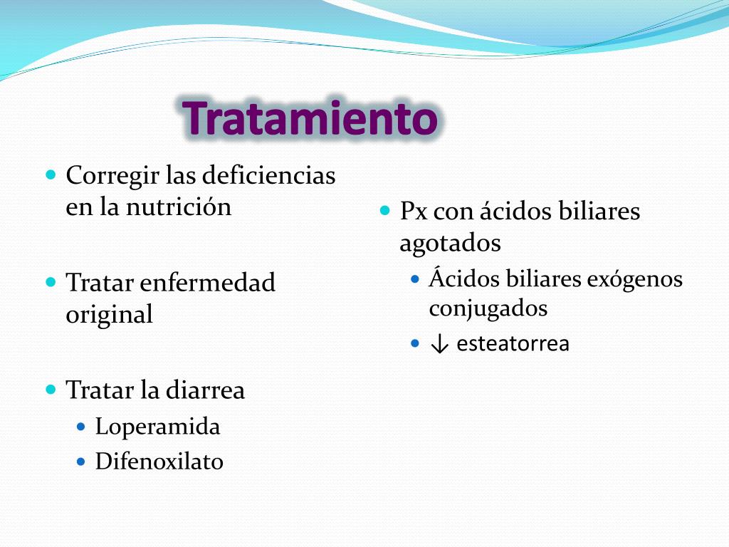 Tratamiento • Px con ácidos biliares agotados • Ácidos biliares exógenos conjugados • ↓ esteatorrea • Corregir las deficiencias en la nutrición • Tratar enfermedad original • Tratar la diarrea • Loperamida • Difenoxilato