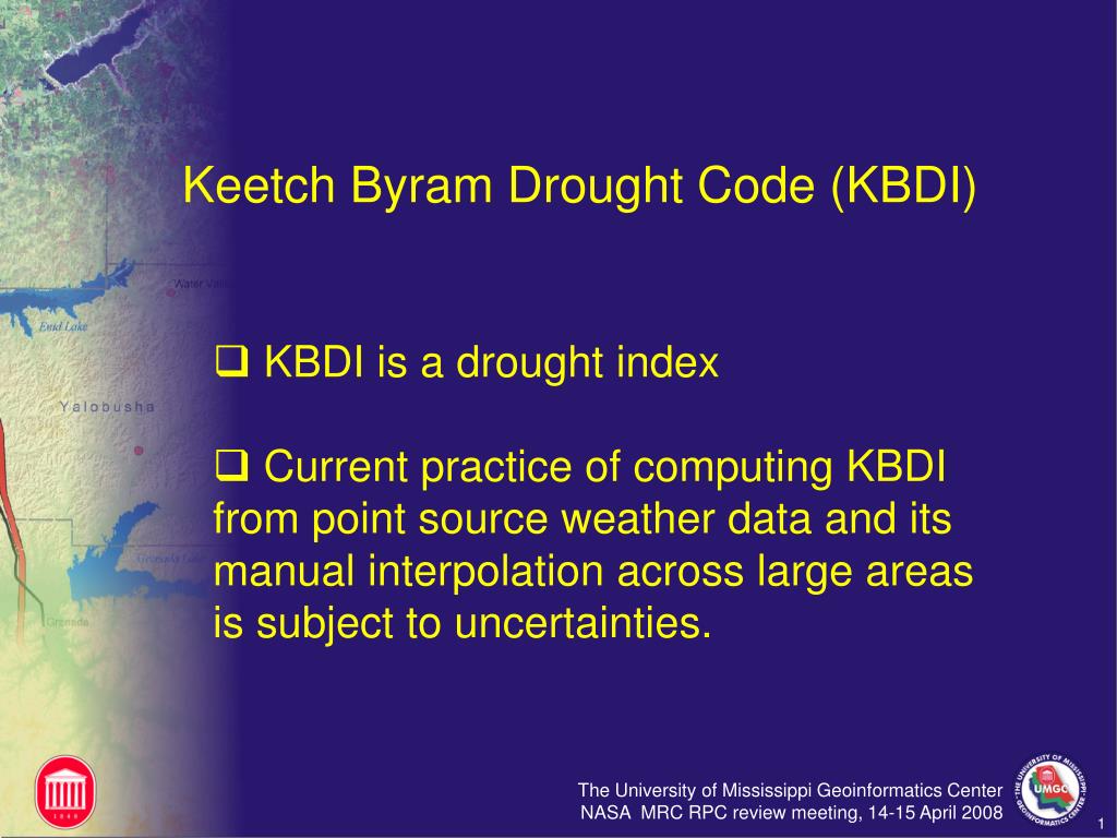 Keetch Byram Drought Code (KBDI) • KBDI is a drought index • Current practice of computing KBDI from point source weather data and its manual interpolation across large areas is subject to uncertainties. 1