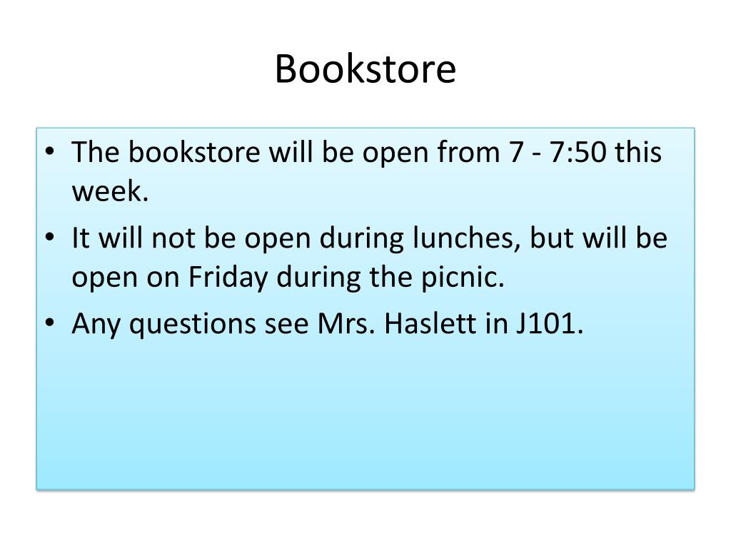 Bookstore • The bookstore will be open from 7 - 7:50 this week. • It will not be open during lunches, but will be open on Friday during the picnic. • Any questions see Mrs. Haslett in J101.