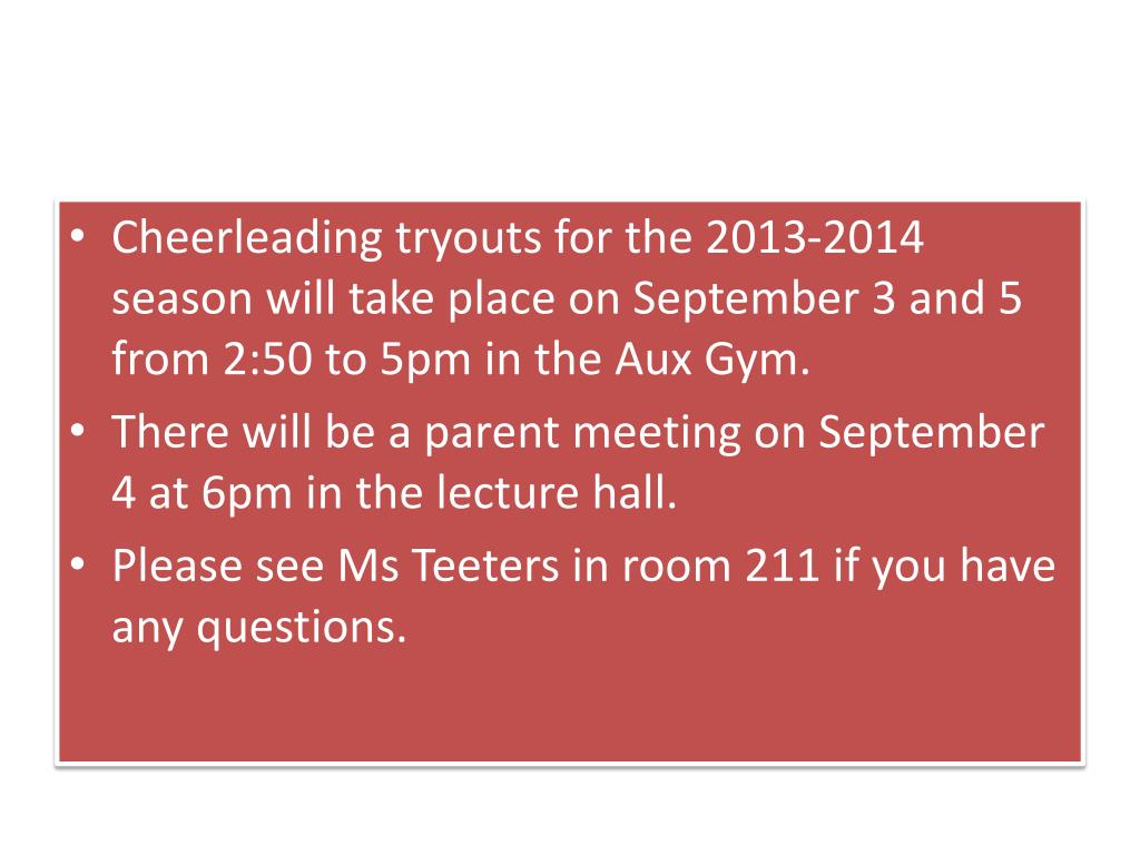 Cheerleading tryouts for the 2013-2014 season will take place on September 3 and 5 from 2:50 to 5pm in the Aux Gym. • There will be a parent meeting on September 4 at 6pm in the lecture hall. • Please see Ms Teeters in room 211 if you have any questions.