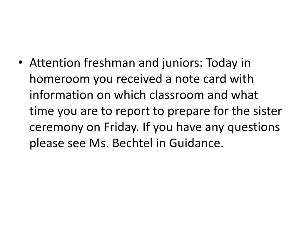 Attention freshman and juniors: Today in homeroom you received a note card with information on which classroom and what time you are to report to prepare for the sister ceremony on Friday. If you have any questions please see Ms. Bechtel in Guidance.