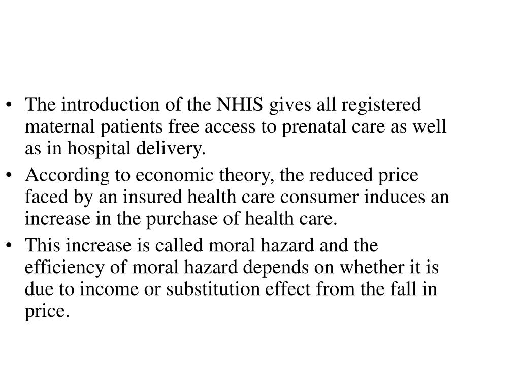 The introduction of the NHIS gives all registered maternal patients free access to prenatal care as well as in hospital delivery. According to economic theory, the reduced price faced by an insured health care consumer induces an increase in the purchase of health care. This increase is called moral hazard and the efficiency of moral hazard depends on whether it is due to income or substitution effect from the fall in price.