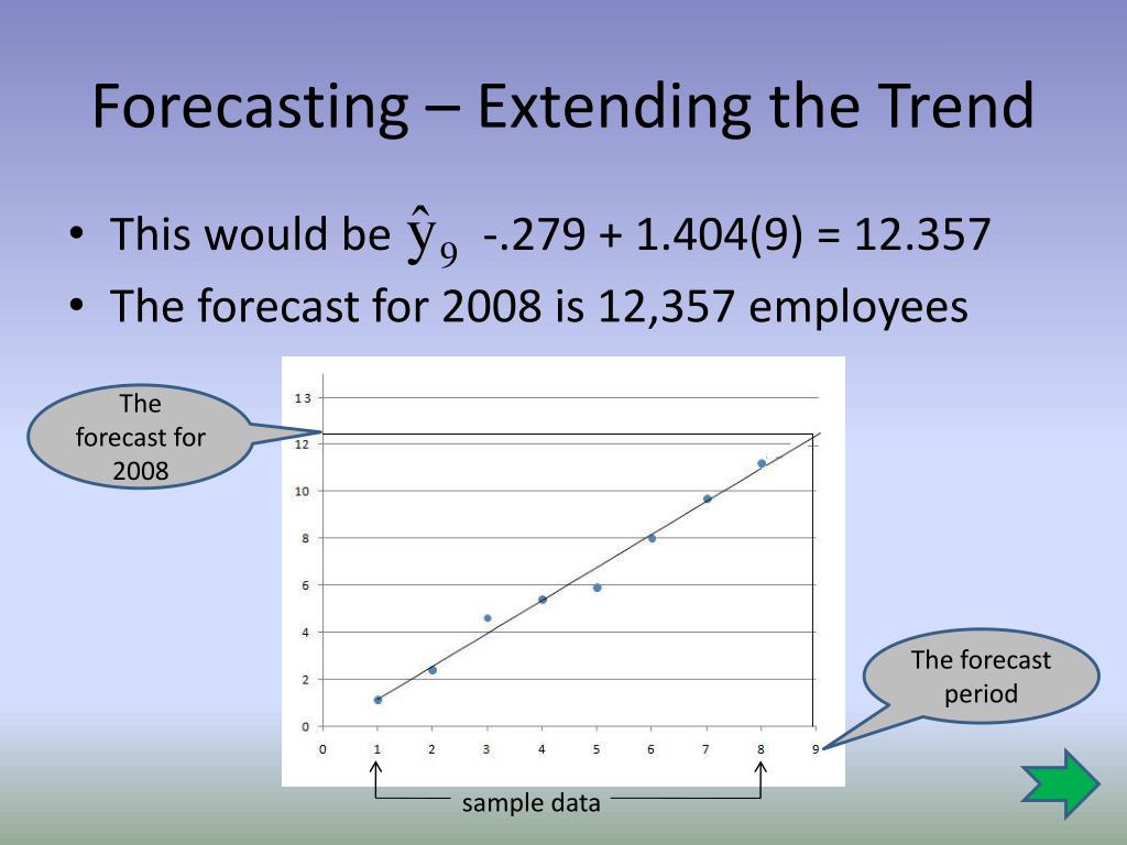 Forecasting – Extending the Trend • This would be -.279 + 1.404(9) = 12.357 • The forecast for 2008 is 12,357 employees The forecast for 2008 The forecast period sample data