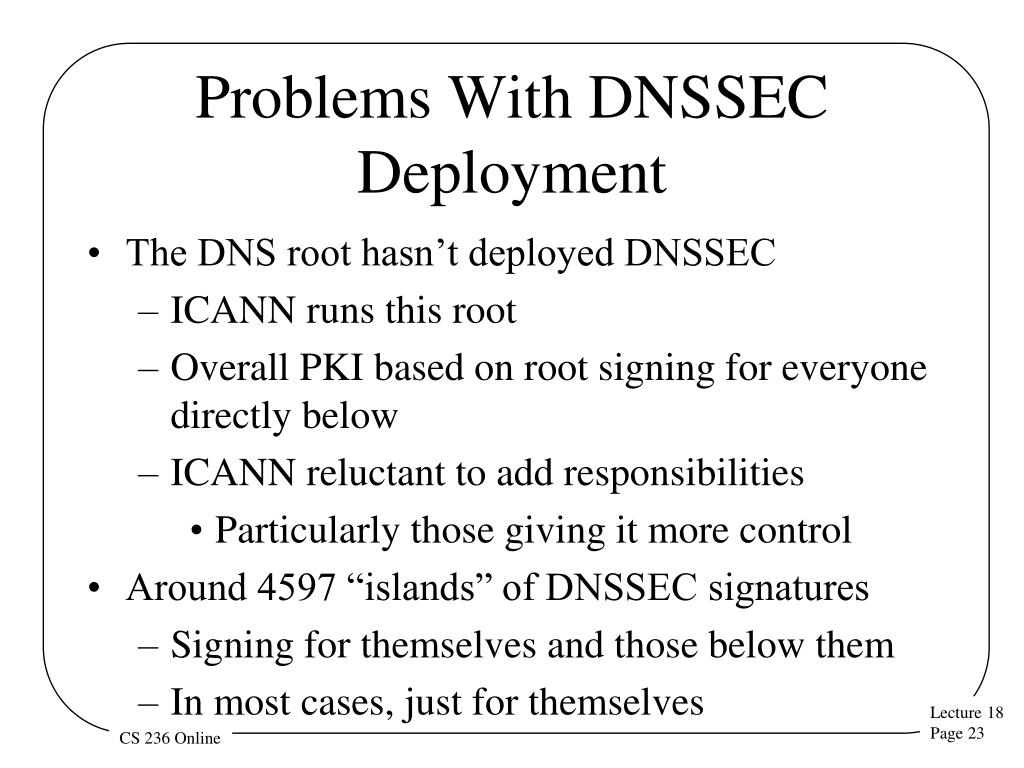 Problems With DNSSEC Deployment • The DNS root hasn’t deployed DNSSEC • ICANN runs this root • Overall PKI based on root signing for everyone directly below • ICANN reluctant to add responsibilities • Particularly those giving it more control • Around 4597 “islands” of DNSSEC signatures • Signing for themselves and those below them • In most cases, just for themselves