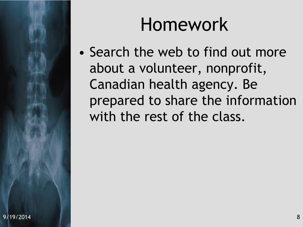 Homework • Search the web to find out more about a volunteer, nonprofit, Canadian health agency. Be prepared to share the information with the rest of the class.