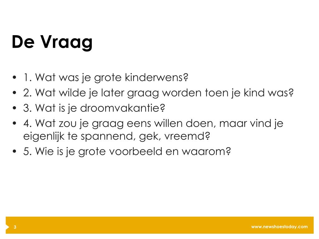 De Vraag • 1. Wat was je grote kinderwens? • 2. Wat wilde je later graag worden toen je kind was? • 3. Wat is je droomvakantie? • 4. Wat zou je graag eens willen doen, maar vind je eigenlijk te spannend, gek, vreemd? • 5. Wie is je grote voorbeeld en waarom?