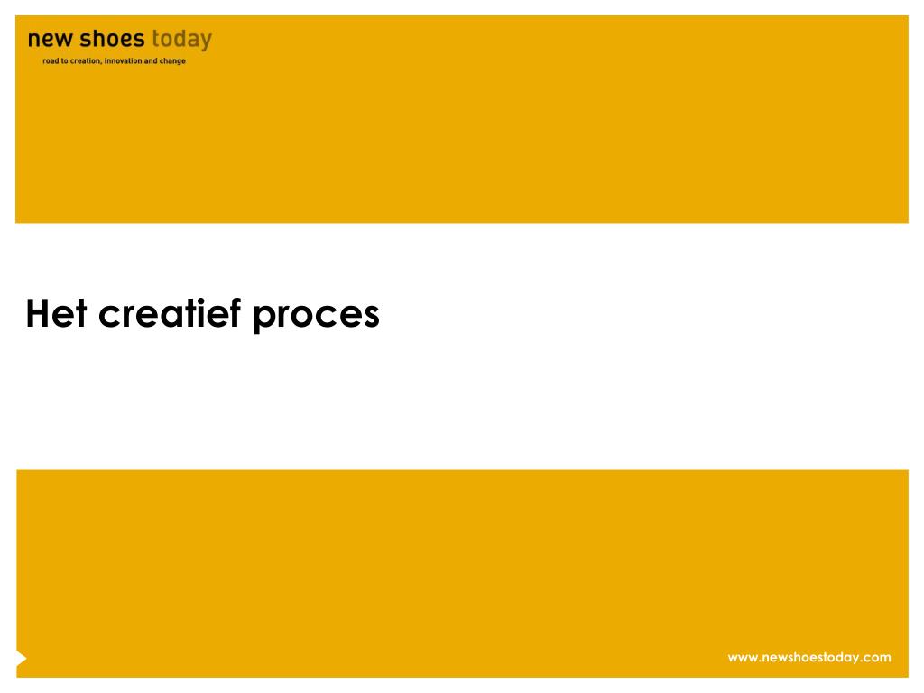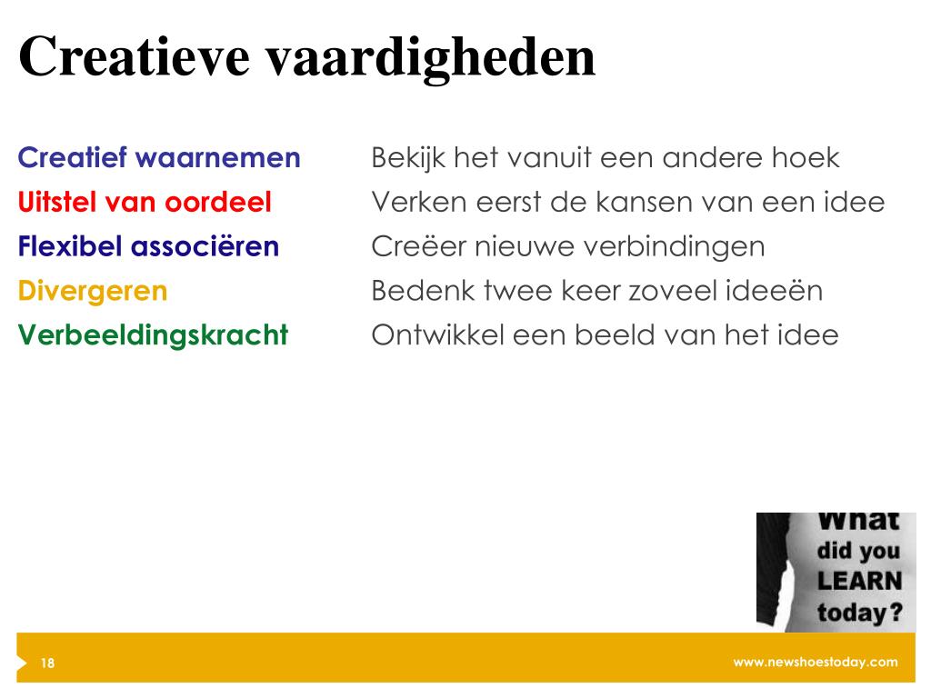 Creatieve vaardigheden Creatief waarnemen Uitstel van oordeel Flexibel associëren Divergeren Verbeeldingskracht Bekijk het vanuit een andere hoek Verken eerst de kansen van een idee Creëer nieuwe verbindingen Bedenk twee keer zoveel ideeën Ontwikkel een beeld van het idee