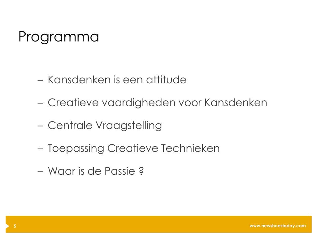 Programma • Kansdenken is een attitude • Creatieve vaardigheden voor Kansdenken • Centrale Vraagstelling • Toepassing Creatieve Technieken • Waar is de Passie ?