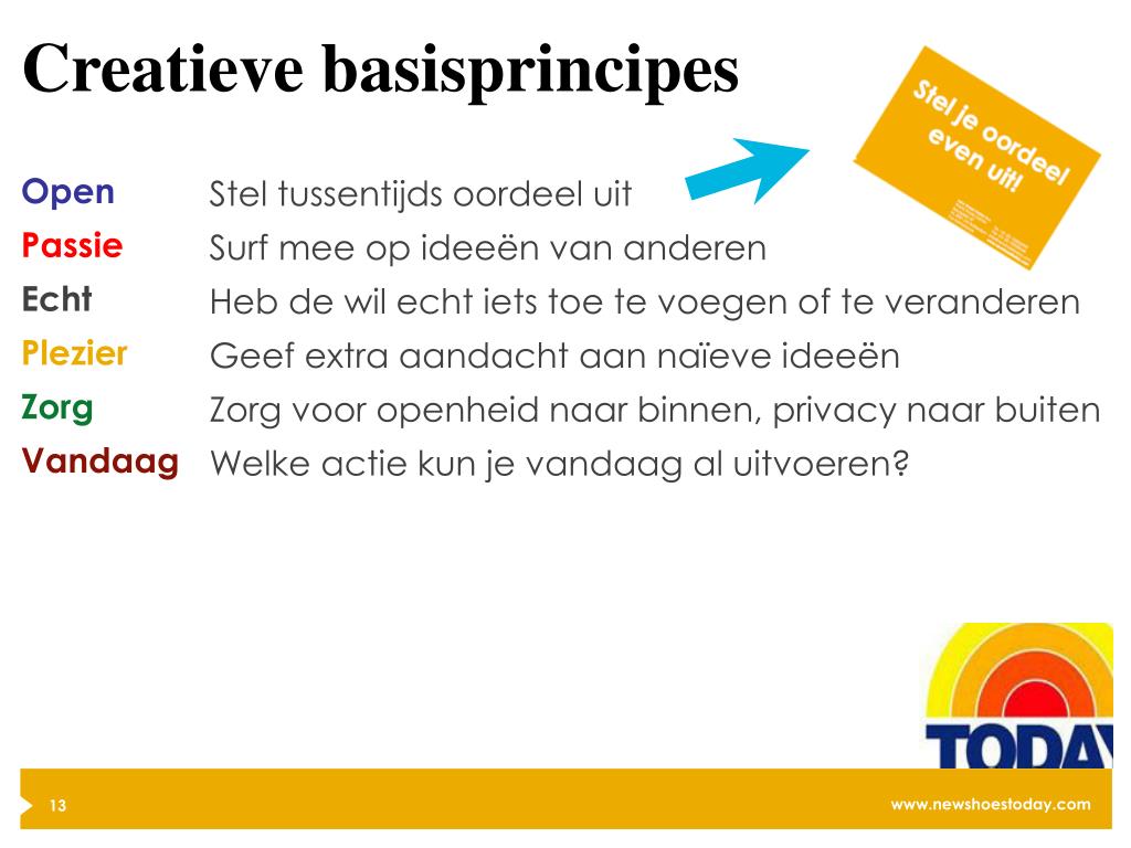 Creatieve basisprincipes Open Passie Echt Plezier Zorg Vandaag Stel tussentijds oordeel uit Surf mee op ideeën van anderen Heb de wil echt iets toe te voegen of te veranderen Geef extra aandacht aan naïeve ideeën Zorg voor openheid naar binnen, privacy naar buiten Welke actie kun je vandaag al uitvoeren?