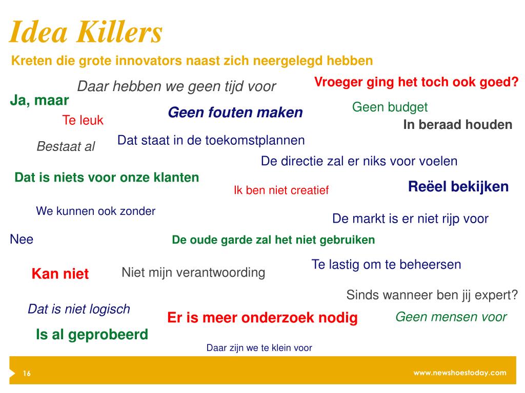 Idea Killers Kreten die grote innovators naast zich neergelegd hebben Vroeger ging het toch ook goed? Daar hebben we geen tijd voor Ja, maar Geen budget Geen fouten maken Te leuk In beraad houden Dat staat in de toekomstplannen Bestaat al De directie zal er niks voor voelen Dat is niets voor onze klanten Reëel bekijken Ik ben niet creatief We kunnen ook zonder De markt is er niet rijp voor Nee De oude garde zal het niet gebruiken Te lastig om te beheersen Niet mijn verantwoording Kan niet Sinds wanneer ben jij expert? Dat is niet logisch Er is meer onderzoek nodig Geen mensen voor Is al geprobeerd Daar zijn we te klein voor