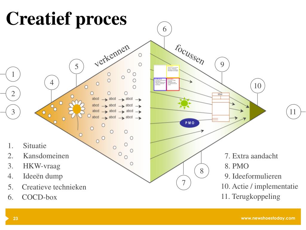 6 9 Creatief proces verkennen focussen 5 1 4 10 2 11 3 Situatie Kansdomeinen HKW-vraag Ideeën dump 7. Extra aandacht 8. PMO 9. Ideeformulieren 10. Actie / implementatie 11. Terugkoppeling 8 7 Creatieve technieken COCD-box