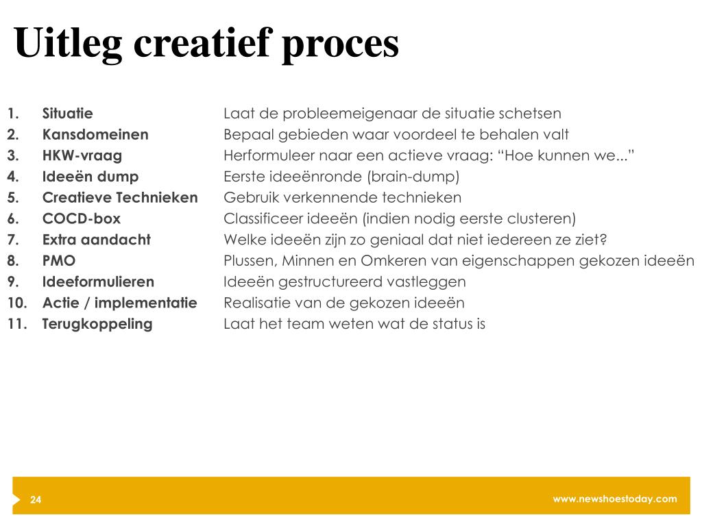 Uitleg creatief proces Situatie Kansdomeinen HKW-vraag Ideeën dump Creatieve Technieken COCD-box Extra aandacht PMO Ideeformulieren Actie / implementatie Terugkoppeling Laat de probleemeigenaar de situatie schetsen Bepaal gebieden waar voordeel te behalen valt Herformuleer naar een actieve vraag: “Hoe kunnen we...” Eerste ideeënronde (brain-dump) Gebruik verkennende technieken Classificeer ideeën (indien nodig eerste clusteren) Welke ideeën zijn zo geniaal dat niet iedereen ze ziet? Plussen, Minnen en Omkeren van eigenschappen gekozen ideeën Ideeën gestructureerd vastleggen Realisatie van de gekozen ideeën Laat het team weten wat de status is