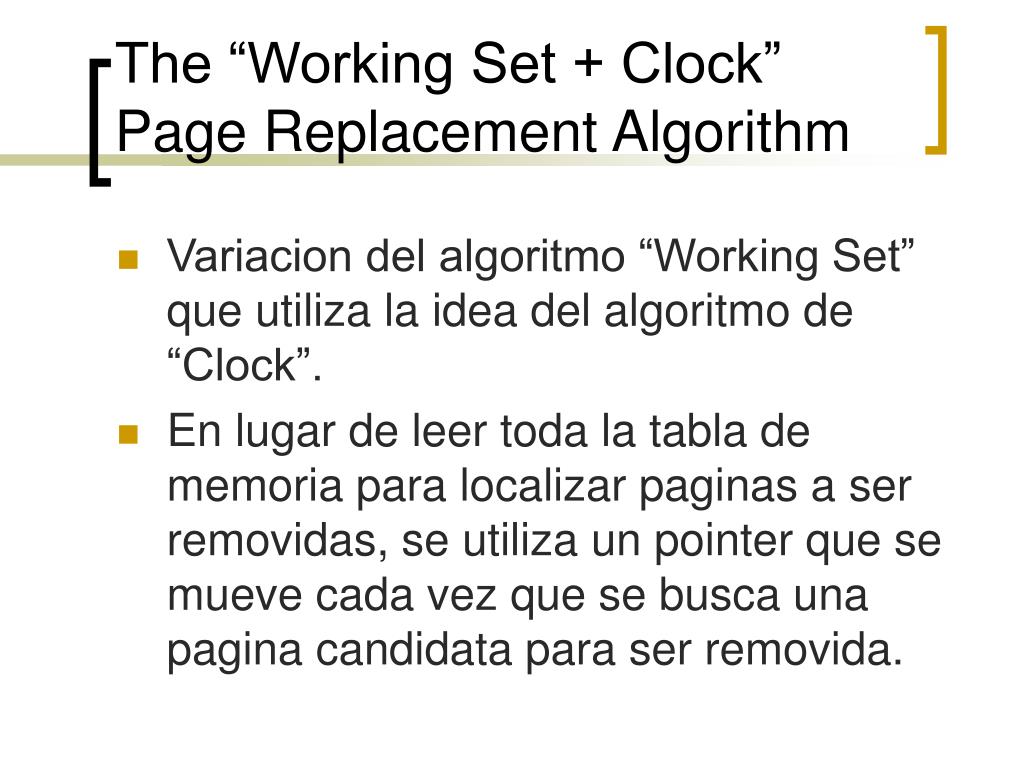 The “Working Set + Clock” Page Replacement Algorithm • Variacion del algoritmo “Working Set” que utiliza la idea del algoritmo de “Clock”. • En lugar de leer toda la tabla de memoria para localizar paginas a ser removidas, se utiliza un pointer que se mueve cada vez que se busca una pagina candidata para ser removida.