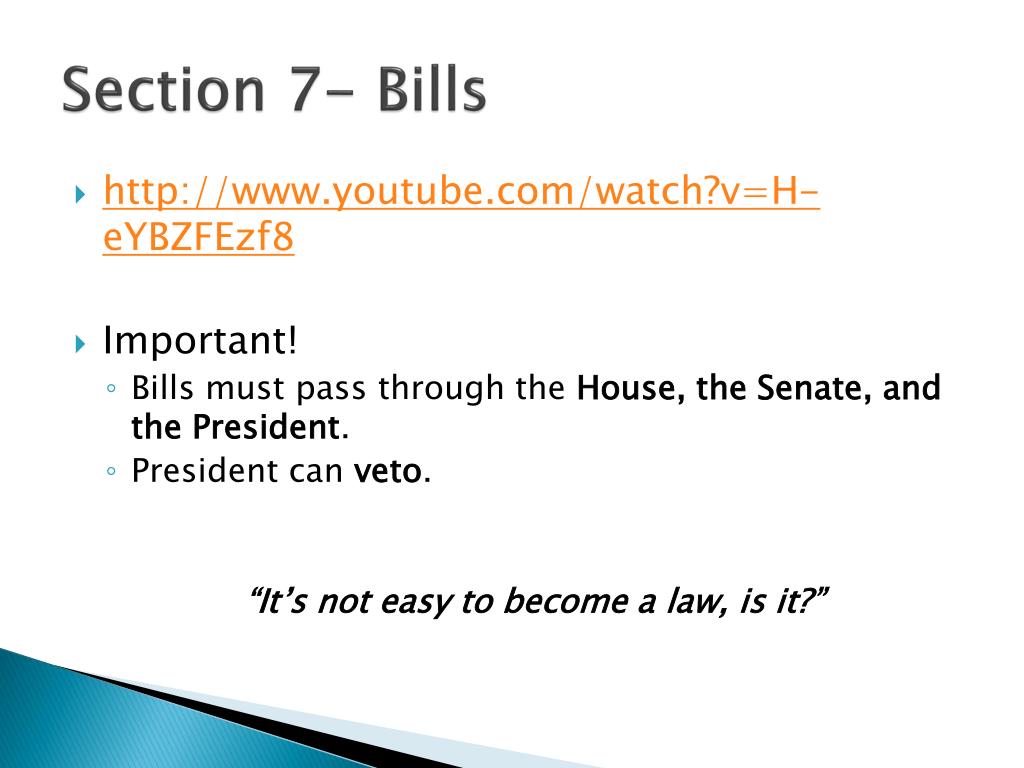 Section 7- Bills • http://www.youtube.com/watch?v=H-eYBZFEzf8 • Important! • Bills must pass through the House, the Senate, and the President. • President can veto. “It’s not easy to become a law, is it?”