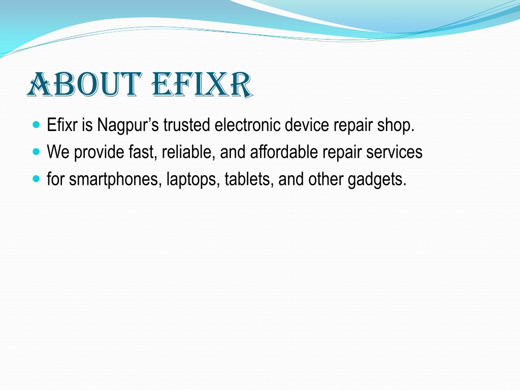 2. About eFixr  Efixr is Nagpur’s trusted electronic device repair shop.  We provide fast, reliable, and affordable repair services  for smartphones, laptops, tablets, and other gadgets.