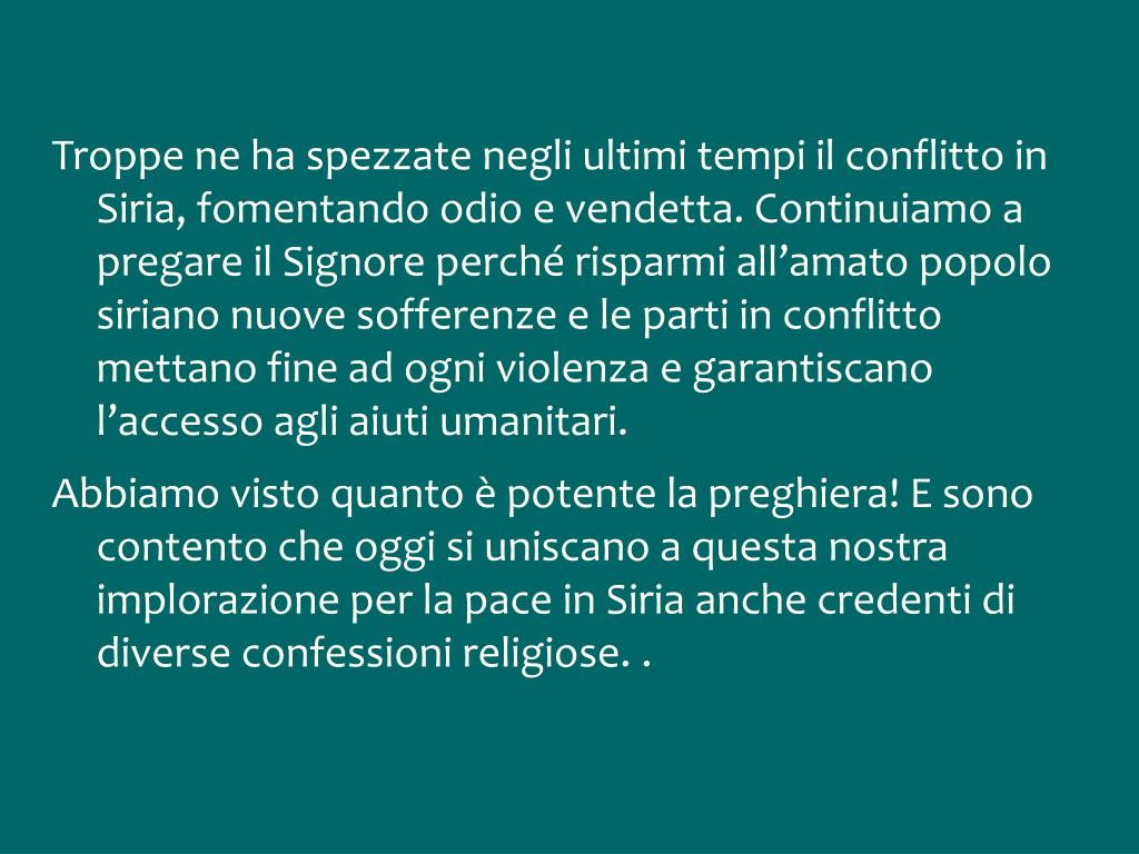 Troppe ne ha spezzate negli ultimi tempi il conflitto in Siria, fomentando odio e vendetta. Continuiamo a pregare il Signore perché risparmi all’amato popolo siriano nuove sofferenze e le parti in conflitto mettano fine ad ogni violenza e garantiscano l’accesso agli aiuti umanitari. Abbiamo visto quanto è potente la preghiera! E sono contento che oggi si uniscano a questa nostra implorazione per la pace in Siria anche credenti di diverse confessioni religiose. .