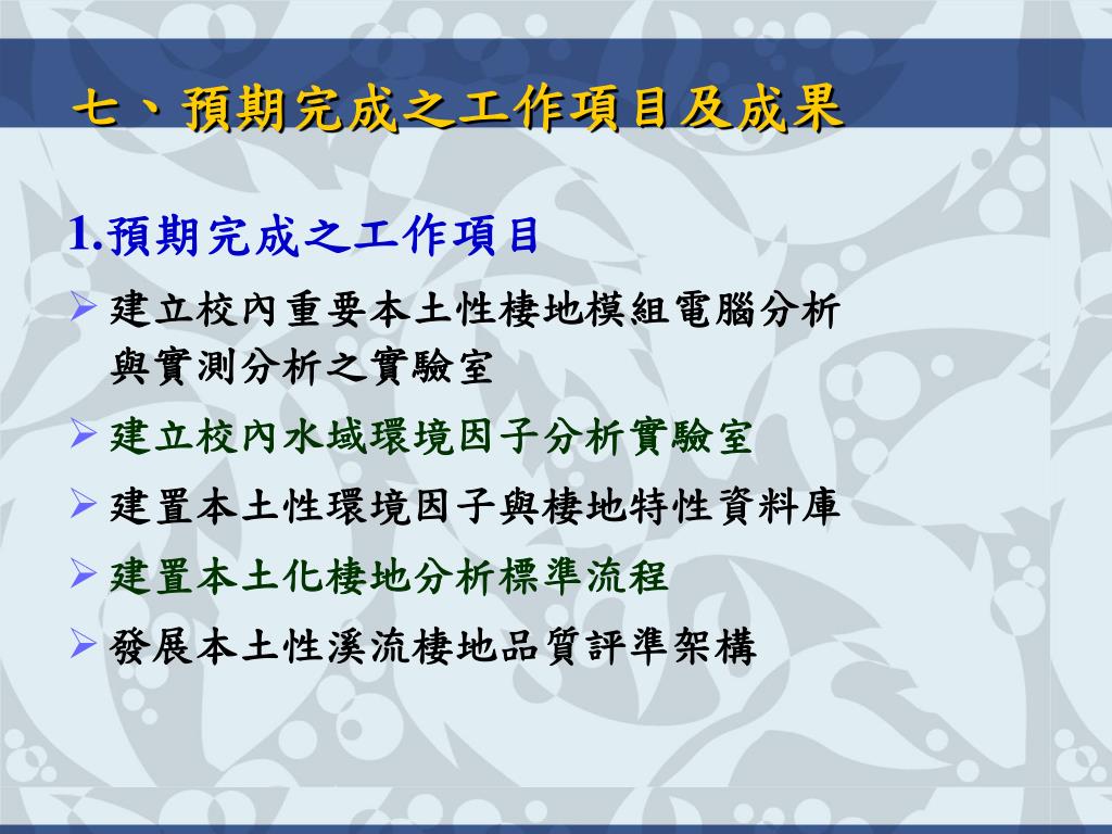 七、預期完成之工作項目及成果 1.預期完成之工作項目 • 建立校內重要本土性棲地模組電腦分析與實測分析之實驗室 • 建立校內水域環境因子分析實驗室 • 建置本土性環境因子與棲地特性資料庫 • 建置本土化棲地分析標準流程 • 發展本土性溪流棲地品質評準架構