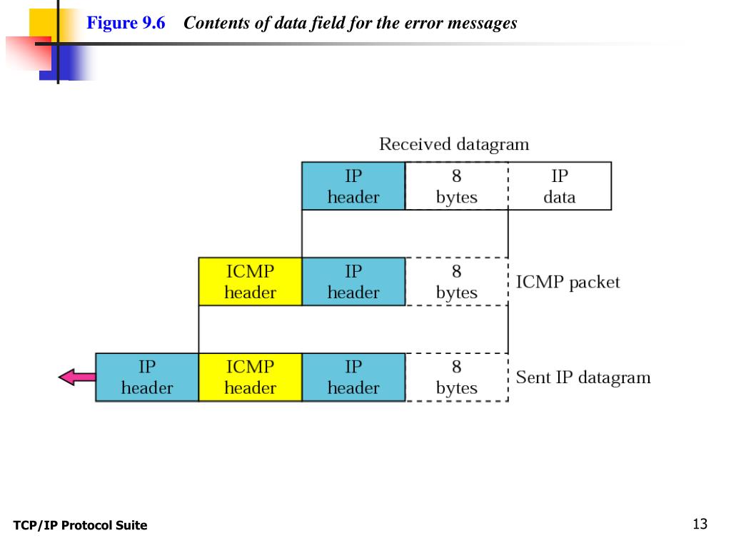 9.3 ERROR REPORTING IP, as an unreliable protocol, is not concerned with error checking and error control. ICMP was designed, in part, to compensate for this shortcoming. ICMP does not correct errors, it simply reports them. The topics discussed in this section include: Destination Unreachable Source Quench Time Exceeded Parameter Problem Redirection TCP/IP Protocol Suite