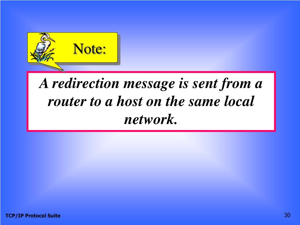 Note: A redirection message is sent from a router to a host on the same local network. TCP/IP Protocol Suite
