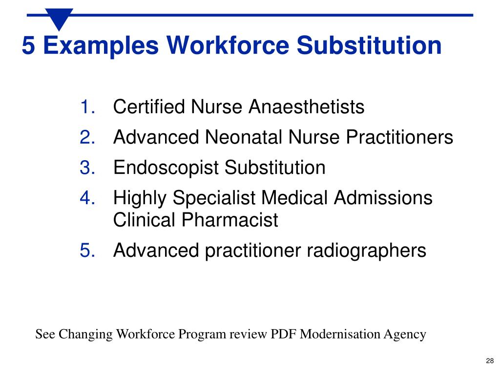 5 Examples Workforce Substitution • Certified Nurse Anaesthetists • Advanced Neonatal Nurse Practitioners • Endoscopist Substitution • Highly Specialist Medical Admissions Clinical Pharmacist • Advancedpractitioner radiographers See Changing Workforce Program review PDF Modernisation Agency
