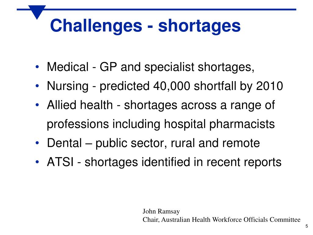 Challenges - shortages • Medical - GP and specialist shortages, • Nursing - predicted 40,000 shortfall by 2010 • Allied health - shortages across a range of professions including hospital pharmacists • Dental – public sector, rural and remote • ATSI - shortages identified in recent reports John Ramsay Chair, Australian Health Workforce Officials Committee