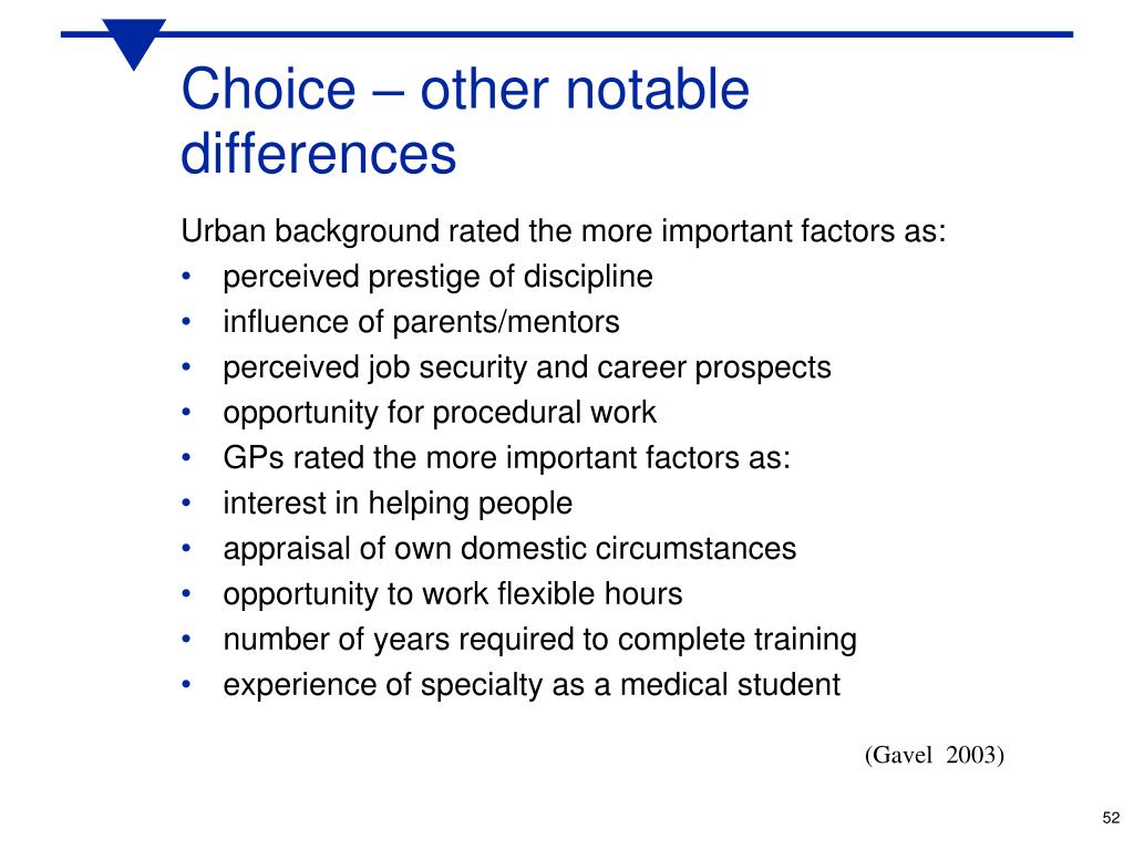 Choice – other notable differences Urban background rated the more important factors as: • perceived prestige of discipline • influence of parents/mentors • perceived job security and career prospects • opportunity for procedural work • GPs rated the more important factors as: • interest in helping people • appraisal of own domestic circumstances • opportunity to work flexible hours • number of years required to complete training • experience of specialty as a medical student (Gavel 2003)