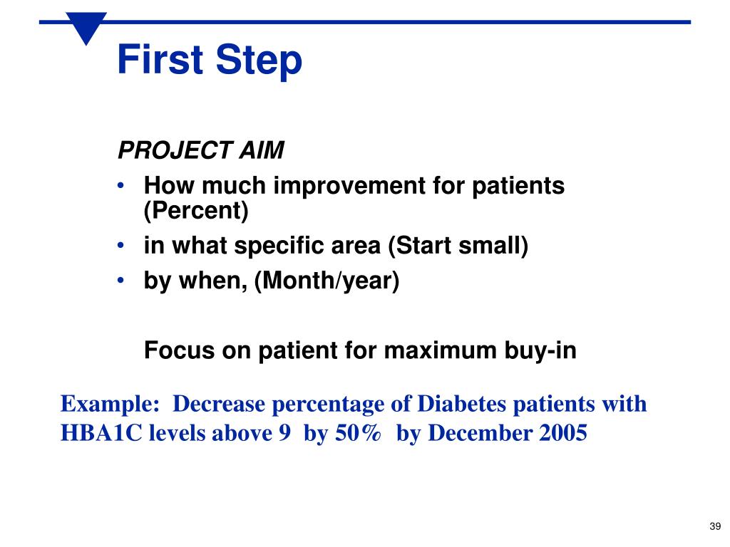 First Step PROJECT AIM • How much improvement for patients (Percent) • in what specific area (Start small) • by when, (Month/year) Focus on patient for maximum buy-in Example: Decrease percentage of Diabetes patients with HBA1C levels above 9 by 50% by December 2005