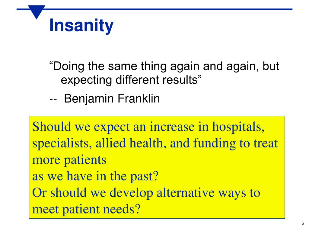 Insanity “Doing the same thing again and again, but expecting different results” -- Benjamin Franklin Should we expect an increase in hospitals, specialists, allied health, and funding to treat more patientsas we have in the past? Or should we develop alternative ways to meet patient needs?