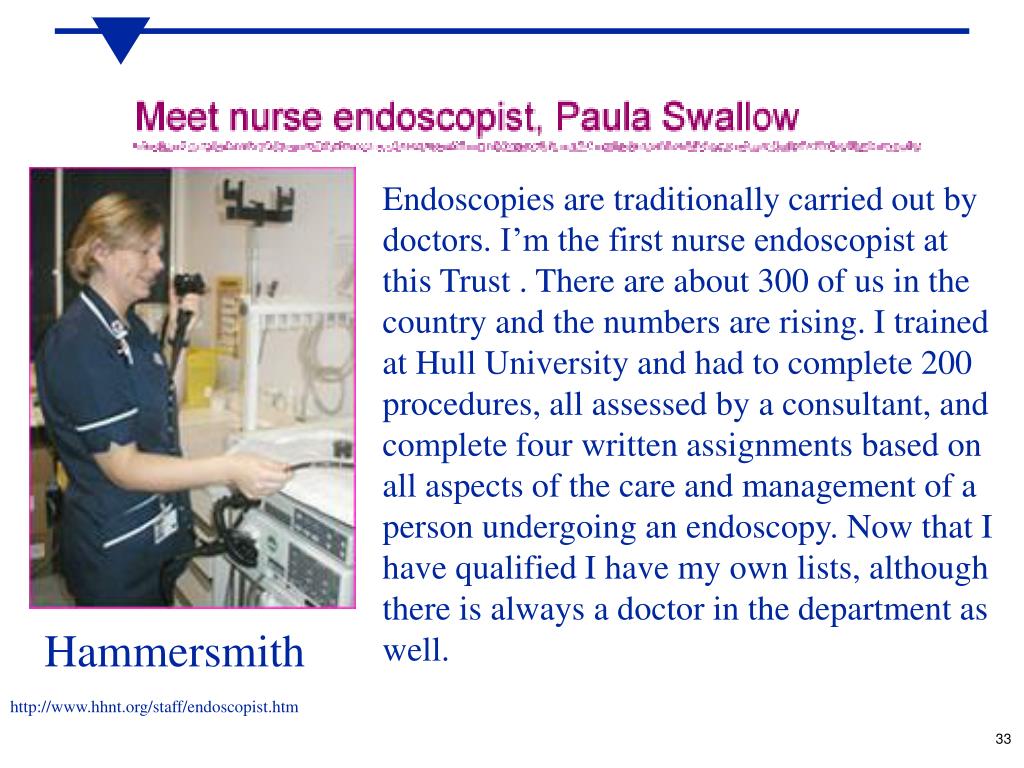 Endoscopies are traditionally carried out by doctors. I’m the first nurse endoscopist at this Trust . There are about 300 of us in the country and the numbers are rising. I trained at Hull University and had to complete 200 procedures, all assessed by a consultant, and complete four written assignments based on all aspects of the care and management of a person undergoing an endoscopy. Now that I have qualified I have my own lists, although there is always a doctor in the department as well. Hammersmith http://www.hhnt.org/staff/endoscopist.htm