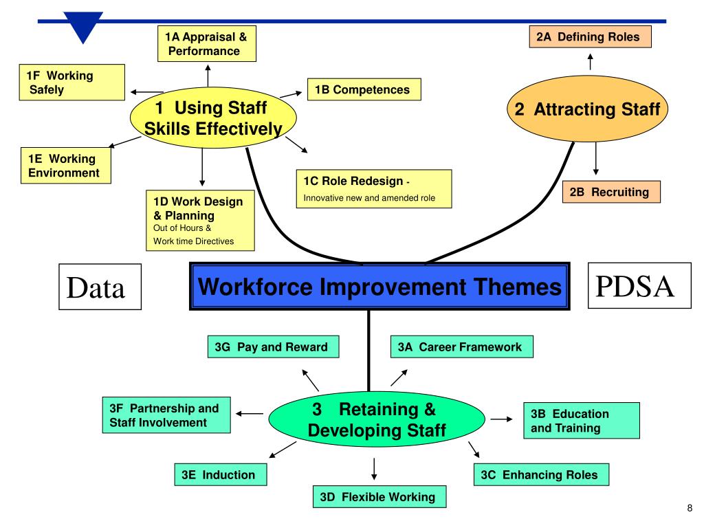 1A Appraisal & Performance 2A Defining Roles 1F Working Safely 2 Attracting Staff 1B Competences 1 Using Staff Skills Effectively 1E Working Environment 1C Role Redesign - Innovative new and amended role 2B Recruiting 1D Work Design & Planning Out of Hours & Work time Directives PDSA Data Workforce Improvement Themes 3G Pay and Reward 3A Career Framework • Retaining & • Developing Staff 3F Partnership and Staff Involvement 3B Education and Training 3E Induction 3C Enhancing Roles 3D Flexible Working