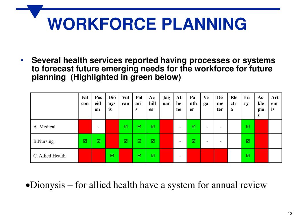 WORKFORCE PLANNING • Several health services reported having processes or systems to forecast future emerging needs for the workforce for future planning (Highlighted in green below) • Dionysis – for allied health have a system for annual review