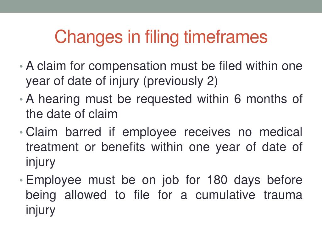 Changes in filing timeframes • A claim for compensation must be filed within one year of date of injury (previously 2) • A hearing must be requested within 6 months of the date of claim • Claim barred if employee receives no medical treatment or benefits within one year of date of injury • Employee must be on job for 180 days before being allowed to file for a cumulative trauma injury