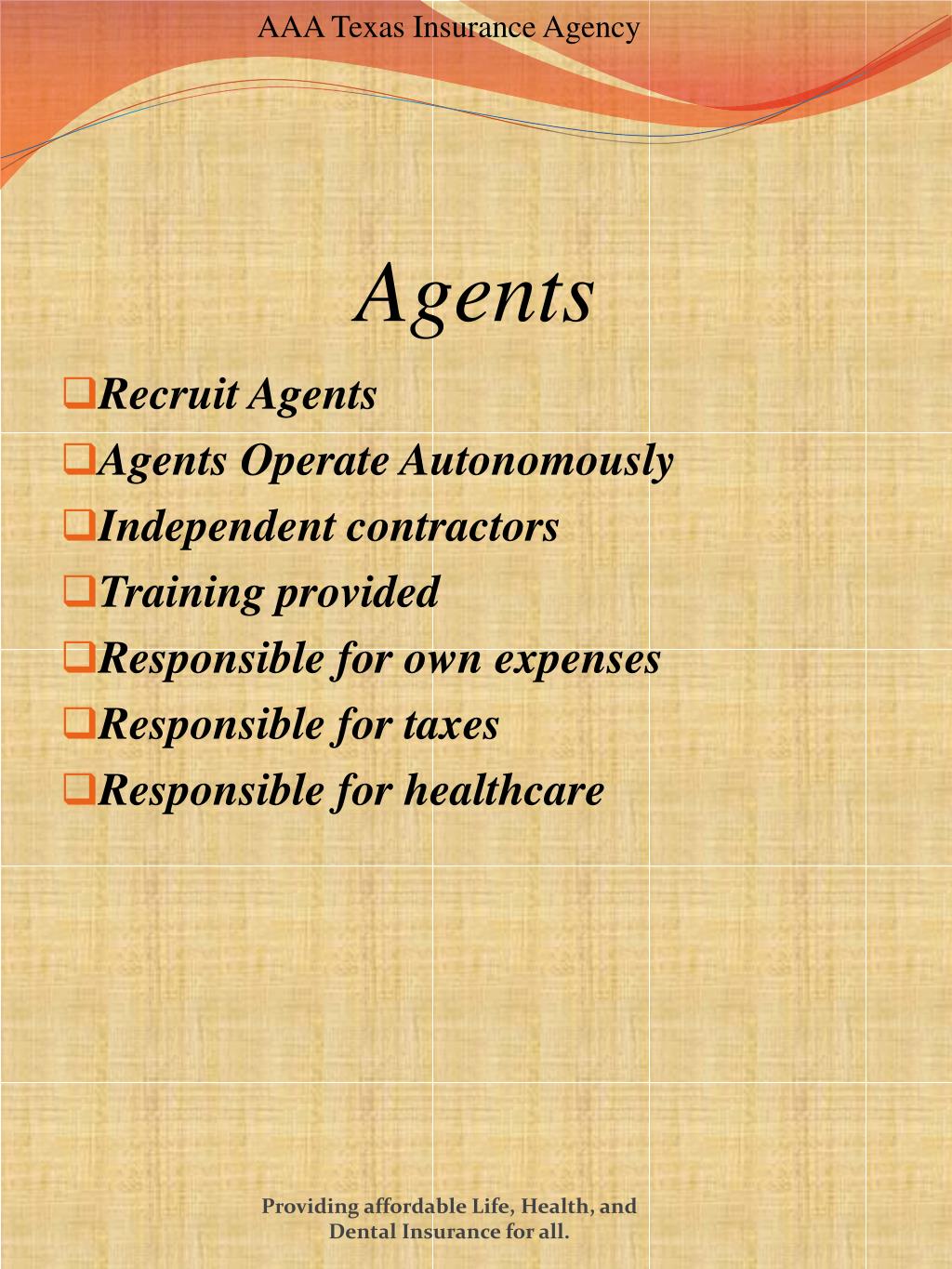 AAA Texas Insurance Agency Agents • Recruit Agents • Agents Operate Autonomously • Independent contractors • Training provided • Responsible for own expenses • Responsible for taxes • Responsible for healthcare Providing affordable Life, Health, and Dental Insurance for all.