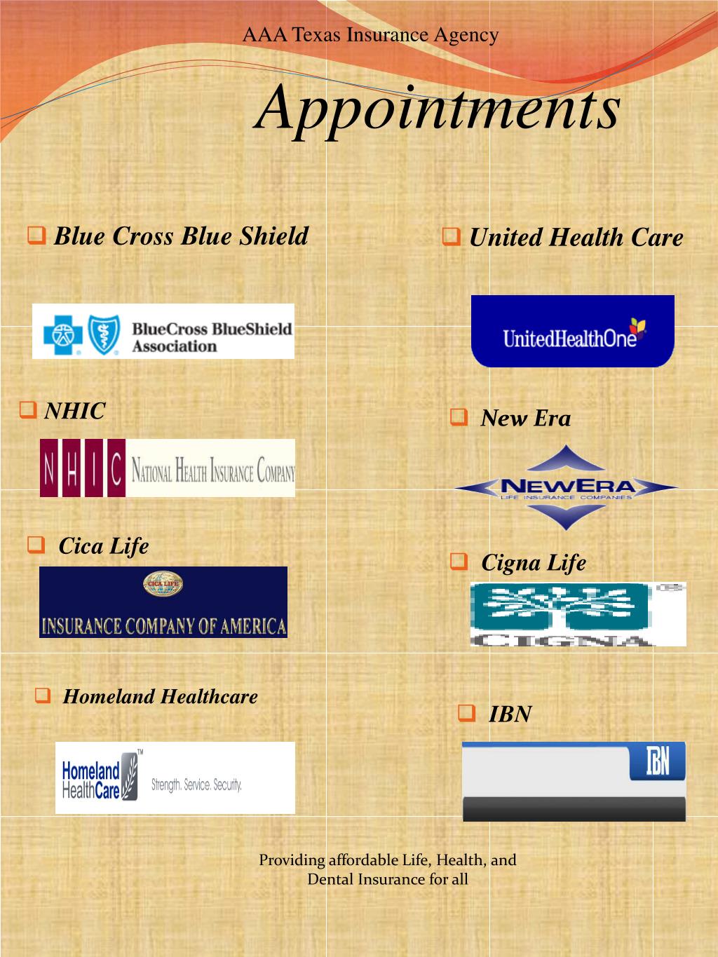 Appointments Blue Cross Blue Shield United Health Care AAA Texas Insurance Agency • NHIC • New Era • Cica Life • Cigna Life • Homeland Healthcare • IBN Providing affordable Life, Health, and Dental Insurance for all
