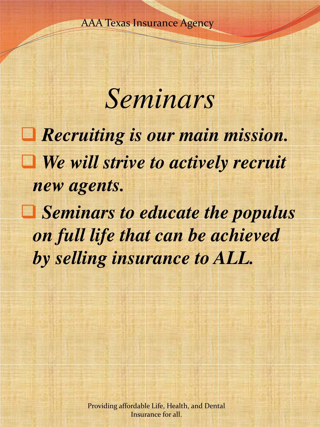 AAA Texas Insurance Agency Seminars • Recruiting is our main mission. • We will strive to actively recruit new agents. • Seminars to educate the populus on full life that can be achieved by selling insurance to ALL. Providing affordable Life, Health, and Dental Insurance for all.