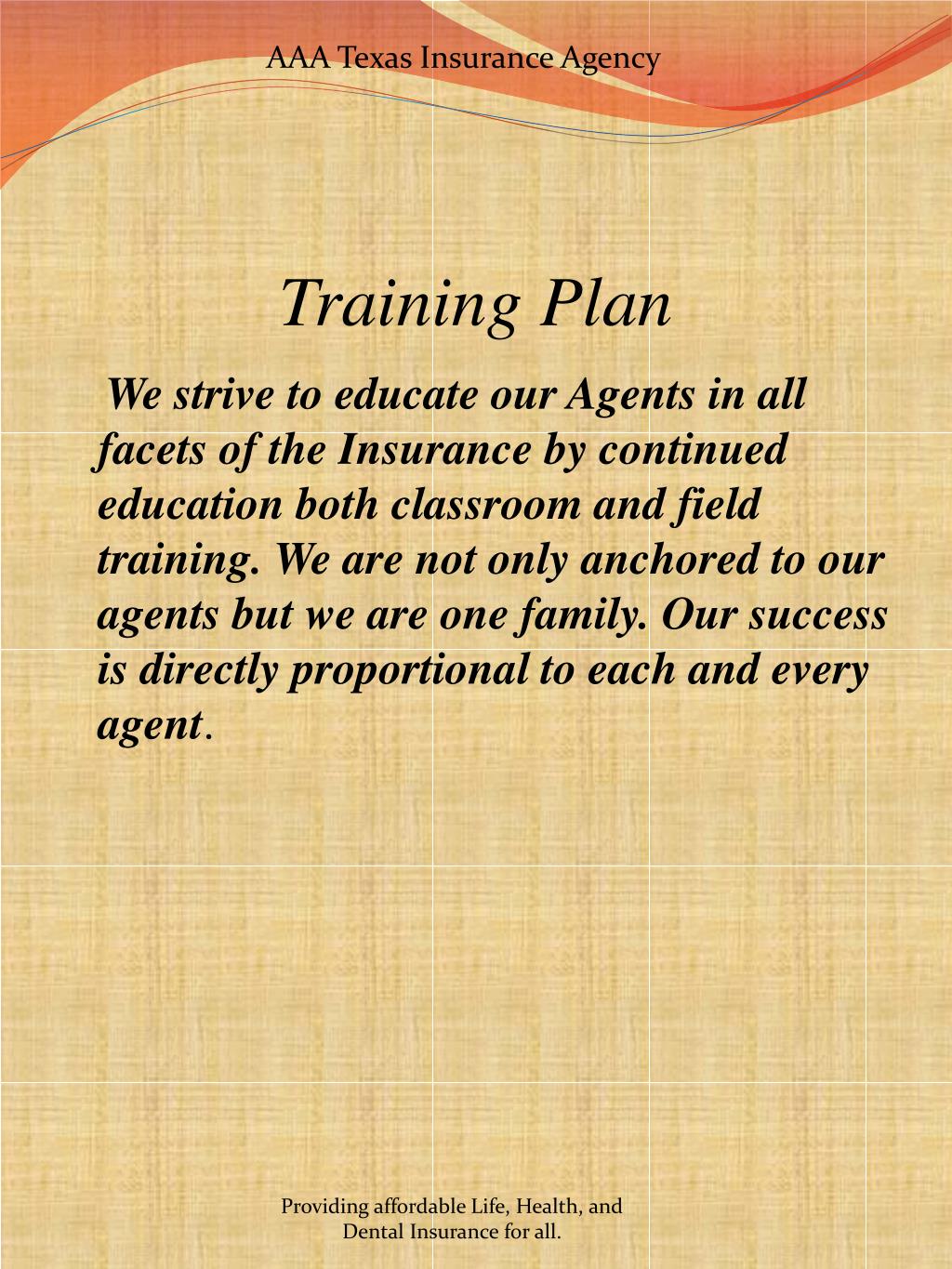 AAA Texas Insurance Agency Training Plan We strive to educate our Agents in all facets of the Insurance by continued education both classroom and field training. We are not only anchored to our agents but we are one family. Our success is directly proportional to each and every agent. Providing affordable Life, Health, and Dental Insurance for all.