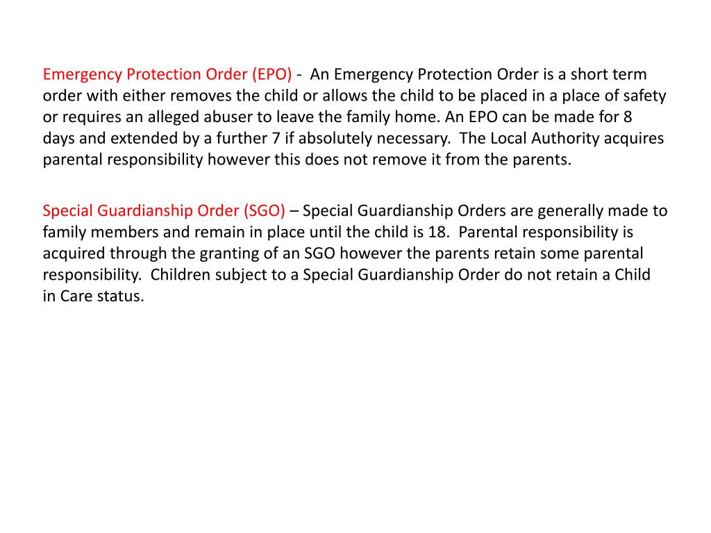 Emergency Protection Order (EPO) - An Emergency Protection Order is a short term order with either removes the child or allows the child to be placed in a place of safety or requires an alleged abuser to leave the family home. An EPO can be made for 8 days and extended by a further 7 if absolutely necessary. The Local Authority acquires parental responsibility however this does not remove it from the parents. Special Guardianship Order (SGO) – Special Guardianship Orders are generally made to family members and remain in place until the child is 18. Parental responsibility is acquired through the granting of an SGO however the parents retain some parental responsibility. Children subject to a Special Guardianship Order do not retain a Child in Care status.