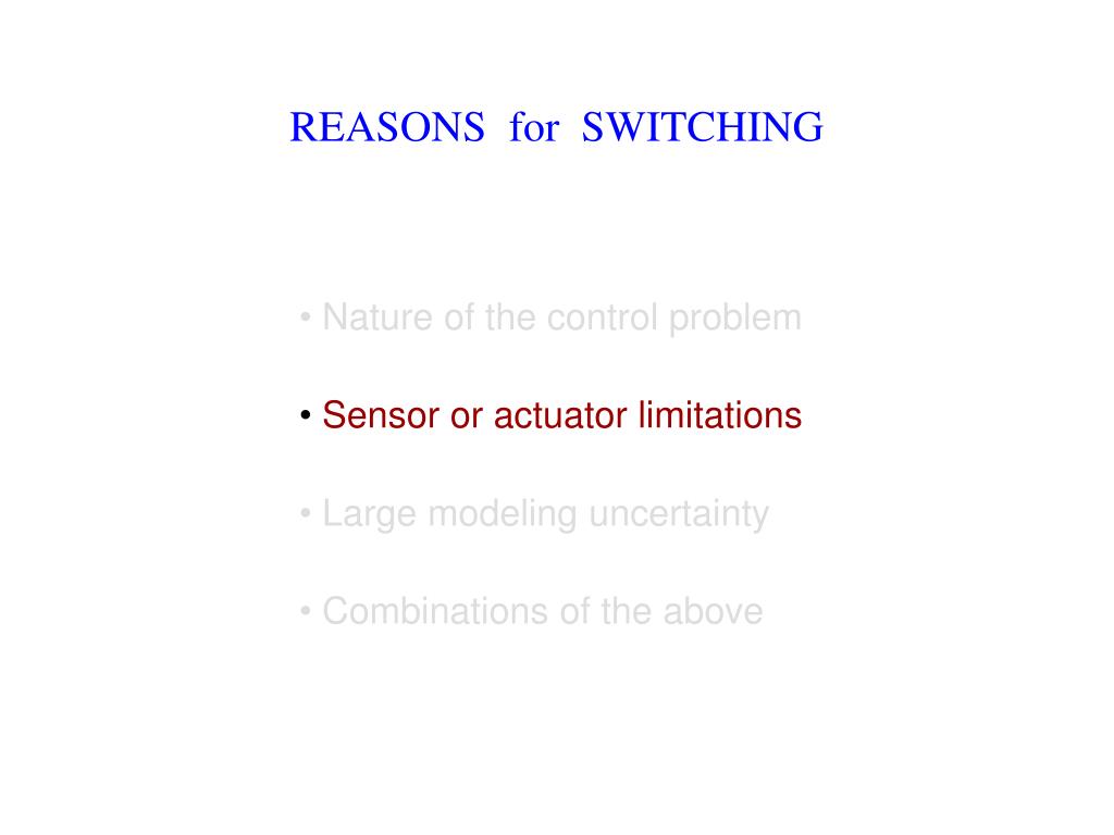 REASONS for SWITCHING • Nature of the control problem • Sensor or actuator limitations • Large modeling uncertainty • Combinations of the above