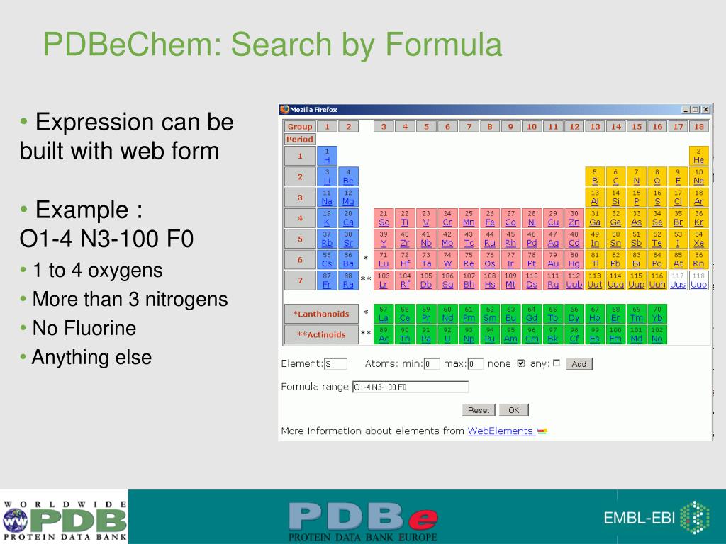 PDBeChem: Search by Formula • Expression can be built with web form • Example : O1-4 N3-100 F0 • 1 to 4 oxygens • More than 3 nitrogens • No Fluorine • Anything else