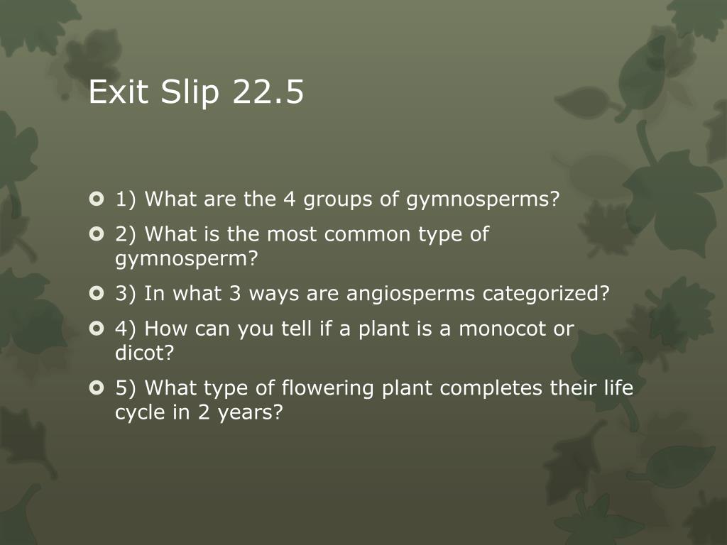 Exit Slip 22.5 • 1) What are the 4 groups of gymnosperms? • 2) What is the most common type of gymnosperm? • 3) In what 3 ways are angiosperms categorized? • 4) How can you tell if a plant is a monocot or dicot? • 5) What type of flowering plant completes their life cycle in 2 years?