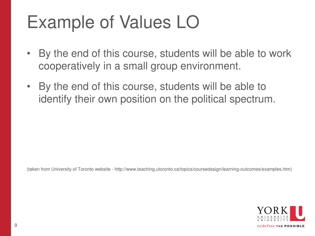 Example of Values LO • By the end of this course, students will be able to work cooperatively in a small group environment. • By the end of this course, students will be able to identify their own position on the political spectrum. (taken from University of Toronto website - http://www.teaching.utoronto.ca/topics/coursedesign/learning-outcomes/examples.htm)