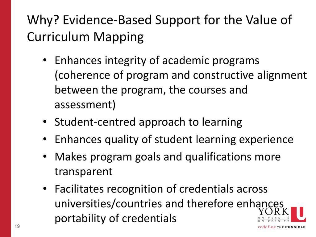 Why? Evidence-Based Support for the Value of Curriculum Mapping • Enhances integrity of academic programs (coherence of program and constructive alignment between the program, the courses and assessment) • Student-centred approach to learning • Enhances quality of student learning experience • Makes program goals and qualifications more transparent • Facilitates recognition of credentials across universities/countries and therefore enhances portability of credentials