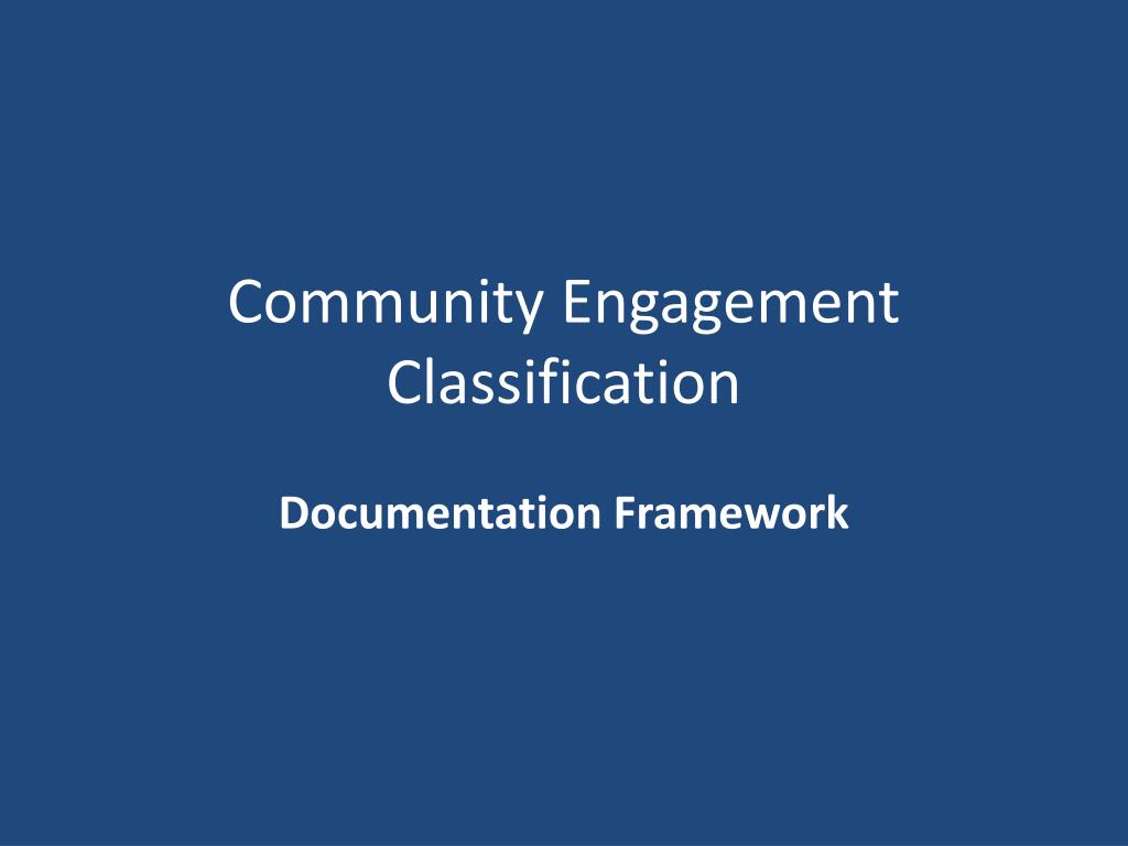 Elective Carnegie Community Engagement Classification A benchmarking tool: • mainly descriptive • self-reported data/information • institutions evaluate various aspects of their processes in relationship to standards of best practice (Documentation Framework) • not a ranking tool – no hierarchy or levels of classification