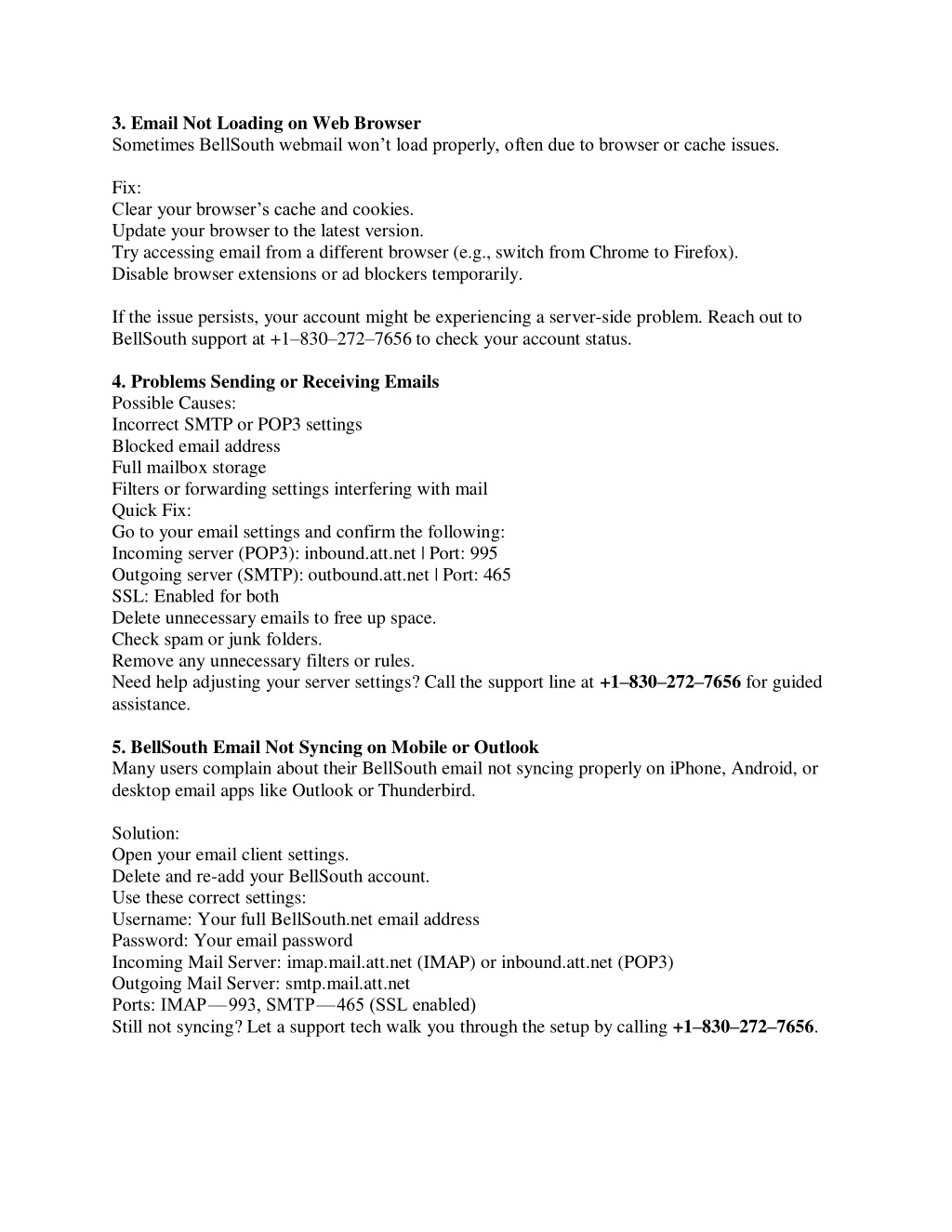 3. Email Not Loading on Web Browser Sometimes BellSouth webmail won’t load properly, often due to browser or cache issues. Fix: Clear your browser’s cache and cookies. Update your browser to the latest version. Try accessing email from a different browser (e.g., switch from Chrome to Firefox). Disable browser extensions or ad blockers temporarily. If the issue persists, your account might be experiencing a server-side problem. Reach out to BellSouth support at +1–830–272–7656 to check your account status. 4. Problems Sending or Receiving Emails Possible Causes: Incorrect SMTP or POP3 settings Blocked email address Full mailbox storage Filters or forwarding settings interfering with mail Quick Fix: Go to your email settings and confirm the following: Incoming server (POP3): inbound.att.net | Port: 995 Outgoing server (SMTP): outbound.att.net | Port: 465 SSL: Enabled for both Delete unnecessary emails to free up space. Check spam or junk folders. Remove any unnecessary filters or rules. Need help adjusting your server settings? Call the support line at +1–830–272–7656 for guided assistance. 5. BellSouth Email Not Syncing on Mobile or Outlook Many users complain about their BellSouth email not syncing properly on iPhone, Android, or desktop email apps like Outlook or Thunderbird. Solution: Open your email client settings. Delete and re-add your BellSouth account. Use these correct settings: Username: Your full BellSouth.net email address Password: Your email password Incoming Mail Server: imap.mail.att.net (IMAP) or inbound.att.net (POP3) Outgoing Mail Server: smtp.mail.att.net Ports: IMAP — 993, SMTP — 465 (SSL enabled) Still not syncing? Let a support tech walk you through the setup by calling +1–830–272–7656.