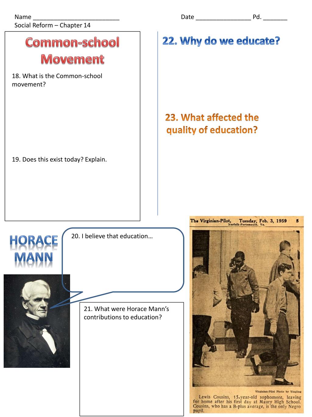 Name _________________________ Date ________________ Pd. _______ Social Reform – Chapter 14 Common-school Movement 22. Why do we educate? 18. What is the Common-school movement? 19. Does this exist today? Explain. 23. What affected the quality of education? Horace Mann 20. I believe that education… 21. What were Horace Mann’s contributions to education?