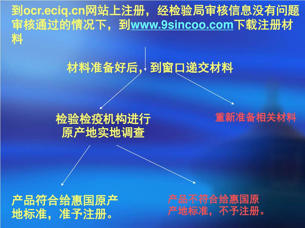 到ocr.eciq.cn网站上注册,经检验局审核信息没有问题审核通过的情况下,到www.9sincoo.com下载注册材料到ocr.eciq.cn网站上注册,经检验局审核信息没有问题审核通过的情况下,到www.9sincoo.com下载注册材料 材料准备好后,到窗口递交材料 检验检疫机构进行原产地实地调查 重新准备相关材料 产品符合给惠国原产地标准,准予注册。 产品不符合给惠国原产地标准,不予注册。