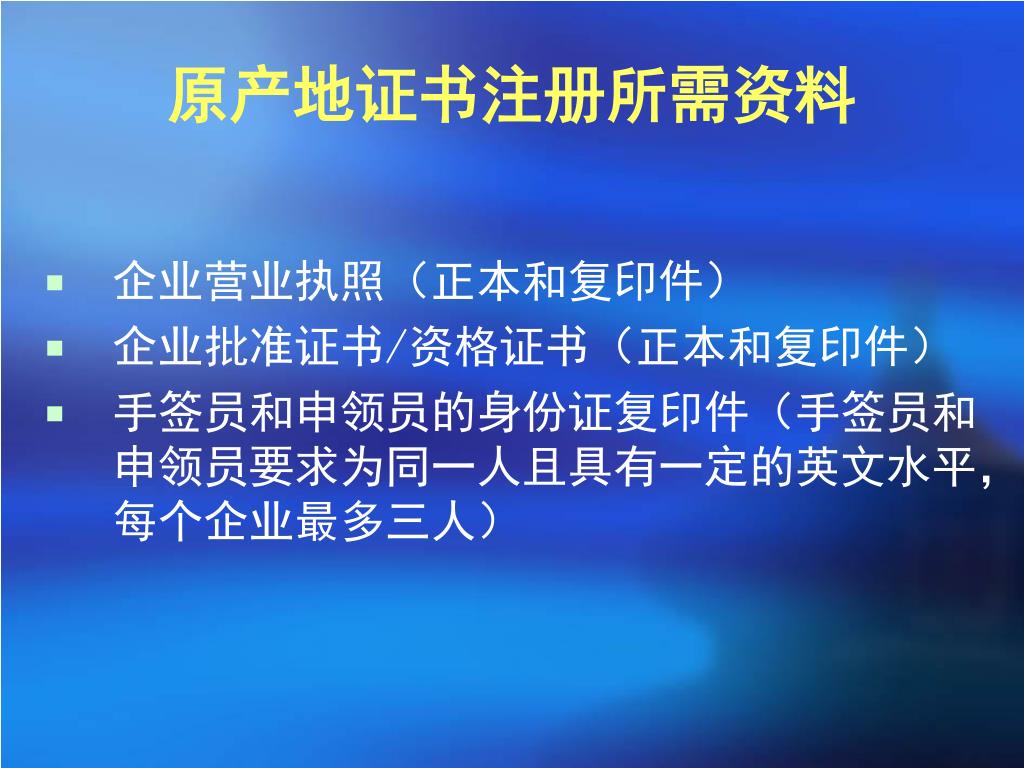 原产地证注册登记程序. 到 ocr.eciq.cn 网站上注册,经检验局审核信息没有问题审核通过的情况下,到 www.9sincoo.com 下载注册材料. 材料准备好后,到窗口递交材料. 检验检疫机构进行原产地实地调查. 重新准备相关材料. 产品符合给惠国原产地标准,准予注册。. 产品不符合给惠国原产地标准,不予注册。. 原产地证书注册所需资料. 企业营业执照(正本和复印件) 企业批准证书 / 资格证书(正本和复印件) 手签员和申领员的身份证复印件(手签员和申领员要求为同一人且具有一定的英文水平,每个企业最多三人). 从国内购买原材料增值税发票(正本和复印件)。