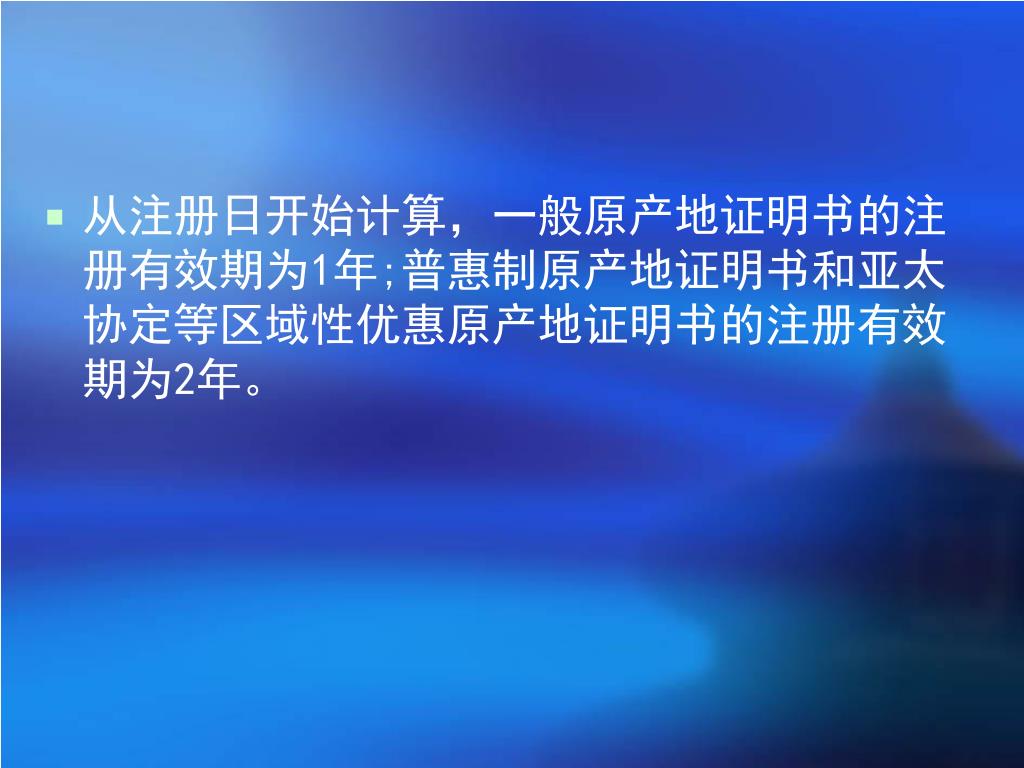 从注册日开始计算,一般原产地证明书的注册有效期为1年;普惠制原产地证明书和亚太协定等区域性优惠原产地证明书的注册有效期为2年。从注册日开始计算,一般原产地证明书的注册有效期为1年;普惠制原产地证明书和亚太协定等区域性优惠原产地证明书的注册有效期为2年。