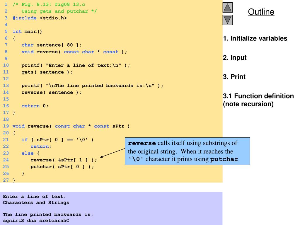 1 /* Fig. 8.13: fig08_13.c 2 Using gets and putchar */ 3 #include <stdio.h> 4 5 int main() 6 { 7 char sentence[ 80 ]; 8 void reverse( constchar * const ); reverse calls itself using substrings of the original string. When it reaches the '\0' character it prints using putchar 9 10 printf( "Enter a line of text:\n" ); 11 gets( sentence ); 12 13 printf( "\nThe line printed backwards is:\n" ); 14 reverse( sentence ); 15 16 return 0; 17 } 18 19 void reverse( constchar * const sPtr ) 20 { 21 if ( sPtr[ 0 ] == '\0' ) 22 return; 23 else { 24 reverse( &sPtr[ 1 ] ); 25 putchar( sPtr[ 0 ] ); 26 } 27 } 1. Initialize variables 2. Input 3. Print 3.1 Function definition (note recursion) Enter a line of text: Characters and Strings The line printed backwards is: sgnirtS dna sretcarahC